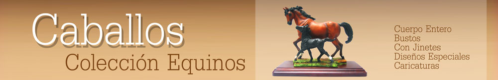 La colección equinos está determinada por cinco subcategorías como son figuras de cuarpo entero, cuerpo entero con jinete, bustos, figuras decorativas y caricaturas.